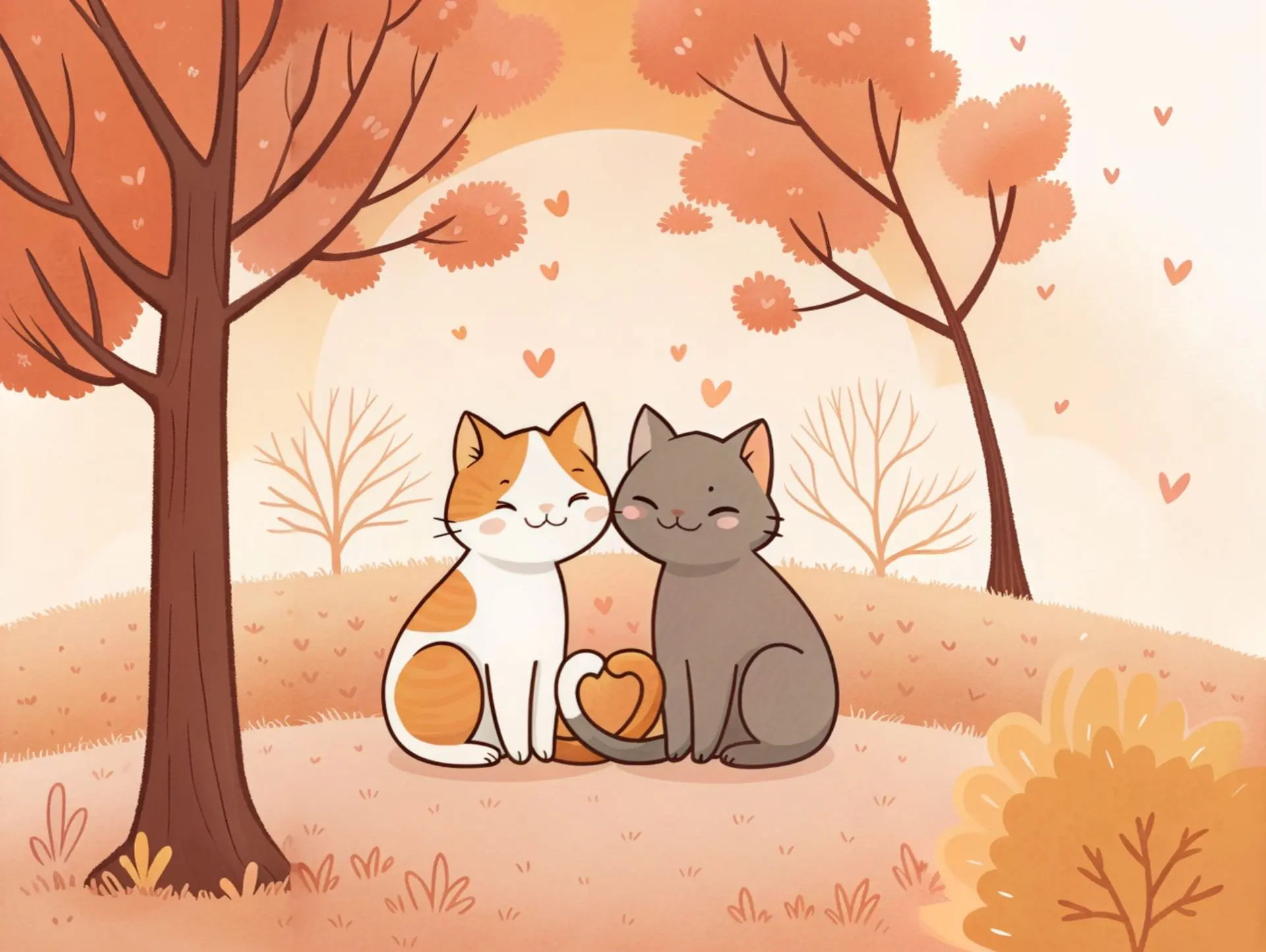 Assis côte à côte, leurs queues enlacées en forme de cœur, ils observent le monde sous un ciel parsemé de cerisiers en fleurs. Ils n’ont pas besoin de mots : leur complicité parle pour eux. Ensemble, ils incarnent l’équilibre parfait entre force et tendresse, mystère et lumière.